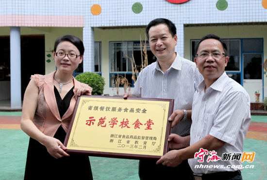 宁海新闻网讯   近年来,我县积极推进实施浙江省餐饮服务食品安全“321”示范工程,努力打造一批餐饮服务食品安全示范单位与示范学校食堂。近日,县中心幼儿园食堂、国华宁海电厂食堂、县太平洋餐饮娱乐有限公司等三家单位,分别被评为浙江省首批省级餐饮服务食品安全示范学校食堂与省级餐饮服务食品安全示范单位。图为昨日,县食品药品监管局和县教育局领导正在给县中心幼儿园食堂授牌。(惠广亮顾莉莉摄)