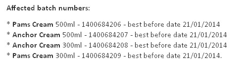 据恒天然本周一发布的公告显示,自愿召回部分300毫升和500毫升瓶装的Anchor和Pams品牌鲜奶油,共8700瓶。这些奶油的最佳食用日期为2014年1月21日之前,配送地区包括从北部Northland到中部Turangi的北岛地区,其中包括Gisborne。