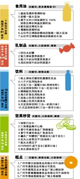 昨日,广州市工商局公布了对广州市销售的食用油、乳制品、干果炒货等年货的抽检结果,同日广州市质监局也公布了对广州市生产领域食品抽检情况,结果显示,8批次食用油不合格,10批次饮料质量有问题。
