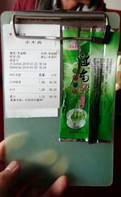 23日下午,记者来到位于海口龙昆南路的水木香茶餐厅暗访。记者坐在大厅内随机点了一壶白沙绿茶,工作人员下单后将单子放在桌上,随后将泡好的“白沙绿茶”送上。