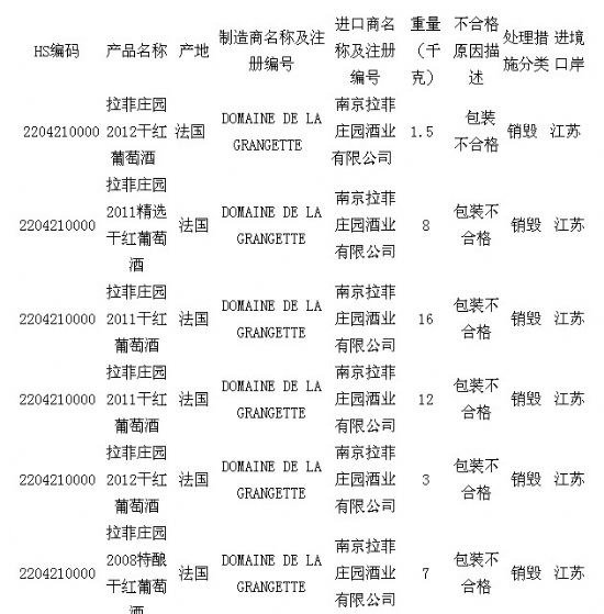 据国家质检总局公布的名单显示,此六款不合格葡萄酒的进口商是南京拉菲庄园酒业有限公司。制造商是:法国DOMAINE DE LA GRANGETTE。质检总局提示广大消费者,此类产品不合格原因皆是包装不合格。