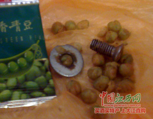 中国江西网讯 记者罗素静、实习生谢裕琛摄影报道:省城一名消费者在超市购买了袋装的蒜香青豆,却从包装里吃到完整的铁质螺丝螺帽。消费者向超市和厂家索赔5万元遭拒,目前,工商部门介入处理中。
