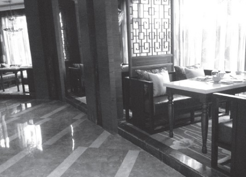 餐馆大厅内的场景。