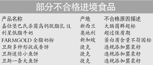新西兰生产的嘉仕堡巴氏杀菌高钙脱脂乳大肠杆菌超标,新加坡生产的FARMGOLD全脂奶粉蛋白质含量未达标,捷克生产的卫斯迷你小鱼饼干违规添加罂粟籽。今年1月份,广东出入境检验检疫局检出了63批次不合格进口食品,包含海鲜、乳制品、休闲食品、饮料等多个种类。对不合格进口食品均予以退货销毁等处理。