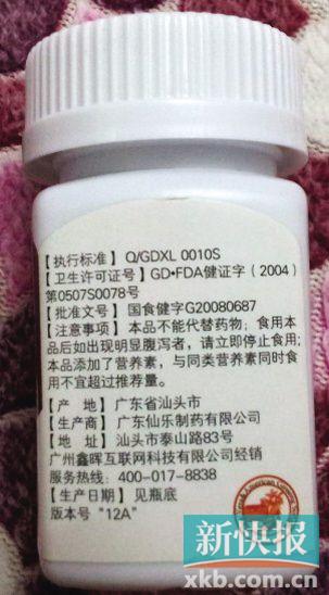 记者看到,标签标注该款产品由广东仙乐制药有限公司生产,广州鑫晖互联网科技有限公司经销,保健品批准文号为国食健字G20080687。