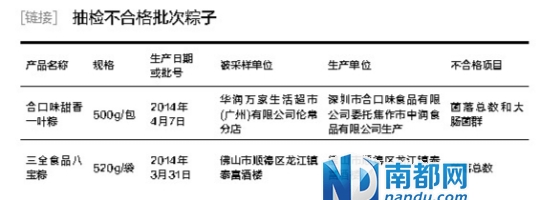 其中,流通领域抽查25批次,不合格1批次,为深圳市合口味食品有限公司委托焦作市中润食品有限公司生产的合口味甜香一叶粽,规格为500g/包,不合格项目为菌落总数和大肠菌群;餐饮领域抽查17批次,不合格1批次,为在佛山市顺德区龙江镇态富酒楼采样的三全食品八宝粽,规格为520g/袋,不合格项目为菌落总数;生产领域抽检2批次,均合格。