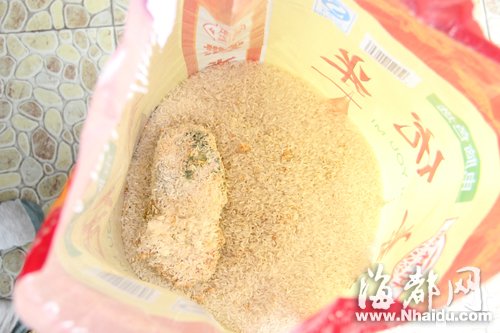 昨日记者看到,这袋大米的生产商为“江西庄稼人粮食有限公司”,生产日期为2014年3月30日,保质期6个月。翻掉表层大米后,记者看到下层的大米发黄,还有一块拳头大小的霉变结块,呈青黄色。