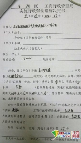 在南昌市华润万家超市八一店,南昌市东湖区工商局公园工商所执法人员经过调查,认为该“滕王阁”牌粽子礼盒上印制了涉嫌误导消费者的广告用语,责令江西乔家栅食品有限公司将礼盒全部下架,等待处理,并开具了相关法律文书。