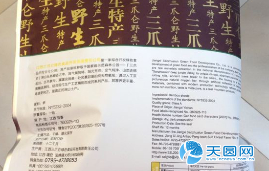 记者看到,杨先生所购买的三种产品均为一家名为江西三爪仑绿色食品开发有限责任公司的企业所生产,生产地址在江西靖安。