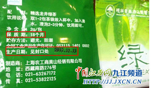网友“柳叶清新”7月27日发帖质问:“九江格林豪泰酒店赠送过期茶叶包,顾客的健康谁买单?”从网友发的照片上记者看到,生产日期一栏,写的是“见封口处”,然后后面一行黑色字体写着“2012年12月13号”,茶叶保质期清晰地显示18个月。