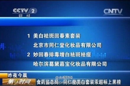 【汞超标!同仁堂美白套装上黑榜】食品药品监管总局发布消息:近期组织对部分化妆品开展监督抽检,发现北京市同仁堂化妆品有限公司生产的标示为“美白祛斑回春素套装”等8批产品不符合规定,食药监总局要求各地对通报的不合格产品一律下架并停止销售,不得恢复生产。