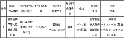 在不合格保健食品方面,本次抽检中发现由南宁富莱欣生物科技有限公司生产的惠普生牌芦荟大豆膳食纤维胶囊因芦荟苷含量不达标被责令下架。