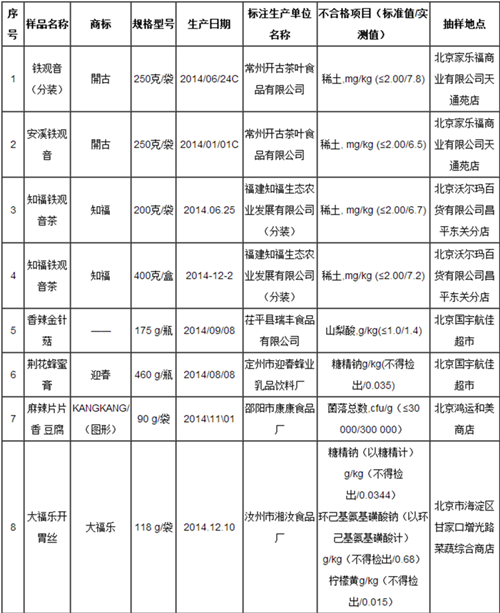 中国经济网记者在不合格食品名单中发现,由常州开古茶叶食品有限公司生产的“開古”牌铁观音(分装)及安溪铁观音、由福建知福生态农业发展有限公司(分装)生产的“知福”牌铁观音均因稀土含量超标而列入不合格名单。此外,由邵阳市康康食品厂生产的“KANGKANG”牌麻辣片片香豆腐中菌落总数超标九倍。