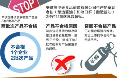 8月12日,安徽省暨合肥市食品药品监管局执法人员,赶往庐江县泥河镇安徽味甲天食品酿造有限公司,针对国家食药监局通报的两批次抽检不合格产品进行检查,对已上市的不合格产品迅速召回。