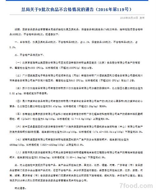 据国家食药监总局对水果及其制品、保健食品等2类食品抽检,不合格样品9批次。