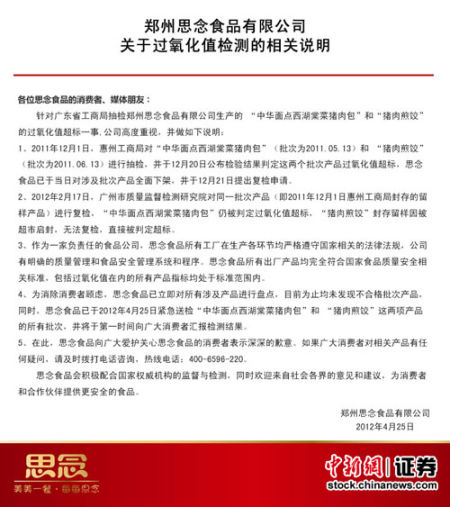 思念食品25日晚间在其网站针对广东省工商局抽检郑州思念食品有限公司生产的“中华面点西湖棠菜猪肉包”和“猪肉煎饺”的过氧化值超标发布声明,并称向消费者表示深深歉意。