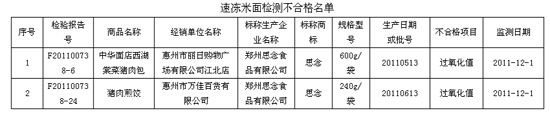 据思念食品的声明,2011年12月1日,惠州工商局对“中华面点西湖棠菜猪肉包”(批次为2011.05.13)和“猪肉煎饺”(批次为2011.06.13)进行抽检,并于12月20日公布检测结果判定这两个批次产品过氧化值超标,思念食品已于当日对涉及批次产品全面下架,并于12月21日提出复检申请。