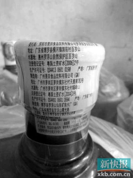 新快报记者连日走访,却发现景田百岁山桶装水外包装标签除了制造商标示不明确外,其中一个制造商的QS编号无法在国家质监总局网站上查证,其水源地也与矿泉水注册信息不同。