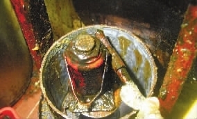 这个所谓的机器就是由一个桶子、一个盖子、一个千斤顶组成,把肥肉倒进桶子、盖好,用千斤顶使劲地榨,油从下面的口子里流出。记者看到整个机器在厨房里已经被油烟熏得乌黑,上面布满了油渍,约有5毫米厚。