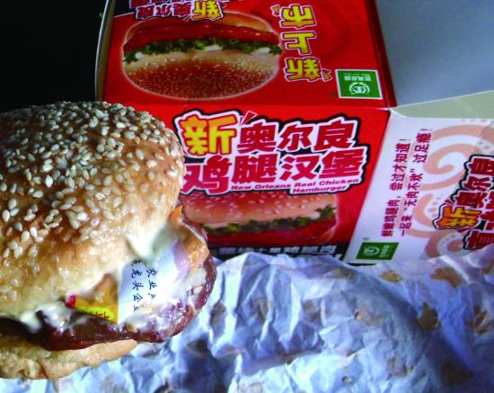 图为宾堡(北京)食品有限公司生产的百万庄园150g新奥尔良真鸡腿汉堡中不明物。