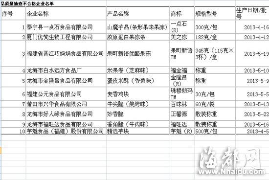 海都网—海峡都市报讯(本网记者 邱也栩) 昨日,福建省质监局公布我省企业生产的果冻、膨化食品监督抽查结果,抽查果冻31批次,3批次不合格;抽查膨化食品61批次,7批次不合格。