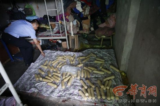 其中一家黑作坊里,员工宿舍摆放的是架子床,地面上的鞋和衣服胡乱摆放着,就是在这样的环境下,地面上晾晒着大量的素鸡,这些豆制品和鞋子的直线距离最短仅仅有30厘米。