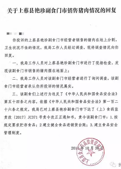 根据《中华人民共和国食品安全法》,除了上蔡县食品药品监督管理局回复函中所列违反第五十四条和第一百二十六条以外,该店还涉嫌违反以下相关规定: 第三十三条 食品生产经营应当符合食品安全标准,并符合下列要求: (一)具有与生产经营的食品品种、数量相适应的食品原料处理和食品加工、包装、贮存等场所,保持该场所环境整洁,并与有毒、有害场所以及其他污染源保持规定的距离; (二)具有与生产经营的食品品种、数量相适应的生产经营设备或者设施,有相应的消毒、更衣、盥洗、采光、照明、通风、防腐、防尘、防蝇、防鼠、防虫、洗涤以及处理废水、存放垃圾和废弃物的设备或者设施; (四)具有合理的设备布局和工艺流程,防止待加工食品与直接入口食品、原料与成品交叉污染,避免食品接触有毒物、不洁物; (六)贮存、运输和装卸食品的容器、工具和设备应当安全、无害,保持清洁,防止食品污染,并符合保证食品安全所需的温度、湿度等特殊要求,不得将食品与有毒、有害物品一同贮存、运输; 上蔡县食品药品监督管理局的回复函,并未体现按照国家法律规定的相应处罚。更为重要的是,对于众品冷鲜肉的销售,类似的违规情况存在多久,违规销售的数量有多少,违规的肉品都流向了哪里,如何对违规肉品进行处理,由此带来的食品安全风险有多大,以及如何加强监督管理,都还没有相应的落实工作。对此我们也将进一步保持关注和跟踪。 |