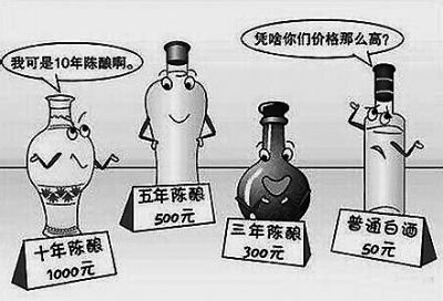 只要商标上标注着“年份酒”的白酒,其价格就比同品牌普通酒高出五六倍之多。以我省某品牌驰名酒为例,一瓶8年陈酿的高度酒售价50元,而12年陈酿和18年陈酿的标价则高达300元至400元之间。