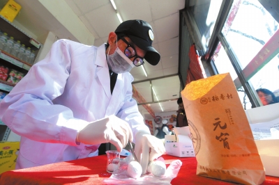 昨天,北京市海淀区食药监局执法人员对商家销售的元宵进行现场抽检。当天,执法人员来到北京市一家稻香村门店,抽取元宵样品,利用快速检测设备现场测试是否含有过氧化苯甲酰,这种添加剂可使面粉增白,但对人体上呼吸道有刺激性。检测结果显示,商品质量合格。执法人员透露,除了现场抽检,还会抽样送检。