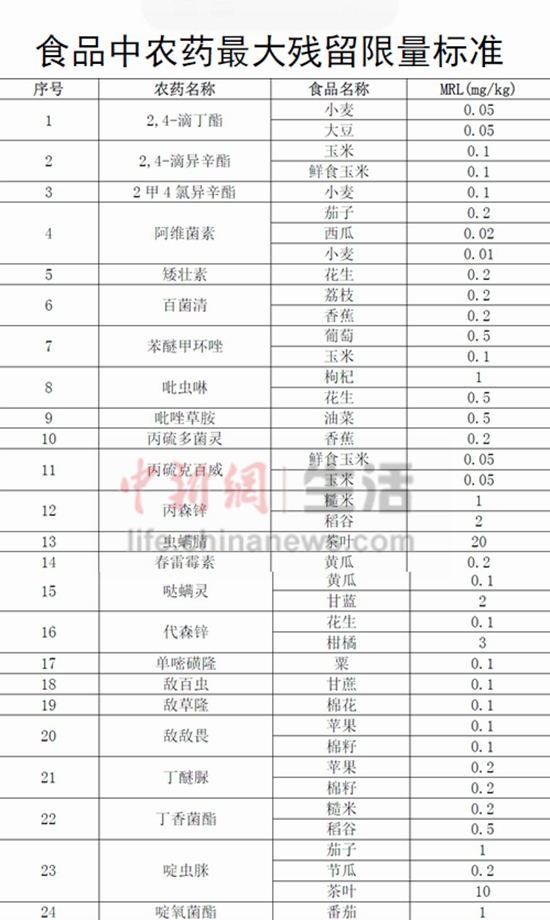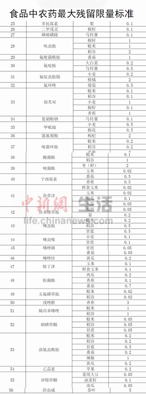 中国对食品中56种农残设定108个最大残留限量(表)