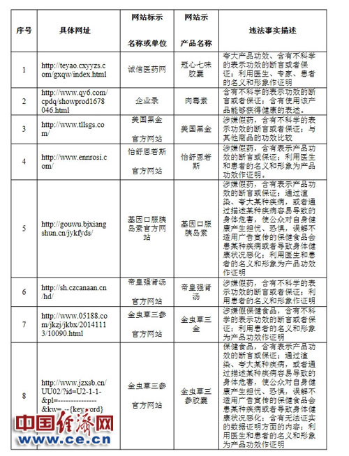 中国经济网北京62日讯 (记者 段丹峰)中国经济网记者今日获悉,国家食药监总局近期监督检查发现,有8个互联网站发布虚假产品信息,涉嫌销售假劣产品,欺骗误导消费者,严重危害公众饮食用药安全。国家食药监总局已将这些违法网站移送有关部门依法查处,并正在组织对违法产品的查处。为了保护公众饮食用药安全,现将下列8家违法网站予以曝光。