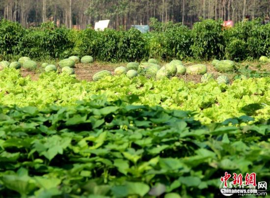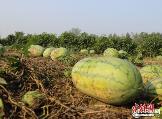 据了解,这株“超级”西瓜结出的最大西瓜重达数十斤。图为“超级”西瓜结出的大个儿西瓜。