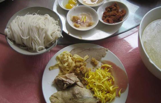 过桥米线,以其制汤考究,吃法特异,滋味鲜甜清香,咸淡相宜而成为云南特有风味小吃。吃时,用大汤碗盛鸡、猪骨熬成的浓汤,汤表面有一层厚油,作用是保持汤汁高温,然后将切的极薄的猪脊肉片,、猪肝片、鱿鱼片、鲤鱼片等放入汤内,用筷子轻轻搅动,使之烫熟,再放入豌豆尖、韭菜、豆腐皮等,最后放入米线,云南蒙自米线吃起来汤汁丰浓,肉片鲜嫩、味道佳美无比