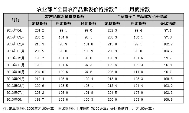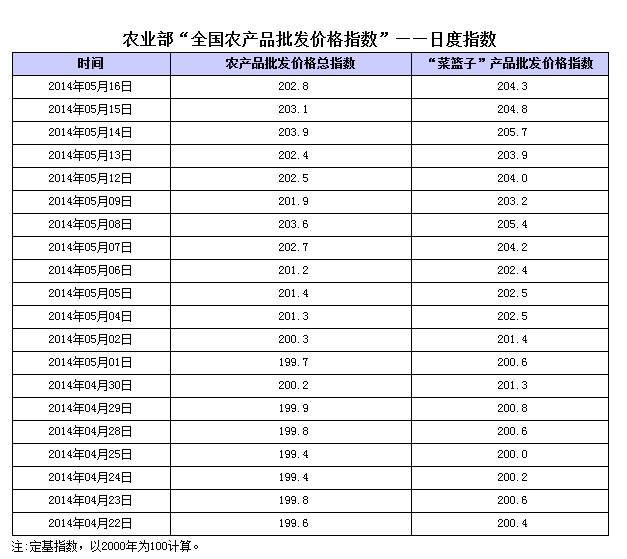 农业部5月16日公布“全国农产品批发市场信息网”监测报告。报告显示5月16日,农产品批发价格总指数是202.8(以2000 年为100),“菜篮子”产品批发价格指数是204.3(以2000年为100)。