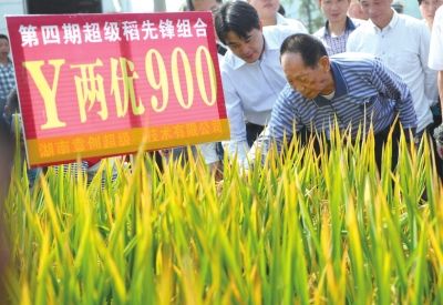 昨天,袁隆平(前右)查看杂交稻生长情况。当天,农业部委派的专家组对湖南省溆浦县横板桥乡红星村的超级杂交稻“Y两优900”进行现场测产验收,通过随机抽样测得平均亩产1026.70公斤,这标志着袁隆平领衔的我国超级杂交稻第四期亩产千公斤攻关取得成功。