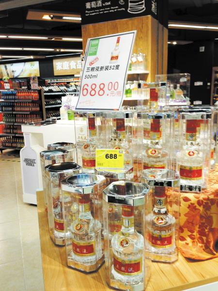昨日,华润万家V+城市超市对五粮液和茅台进行降价促销。彭红丹 摄