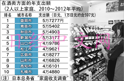 据《日本经济新闻》中文网报道,日本即将进入今年的年末聚会旺季,年会上少不了的就是敞开喝酒。根据日本总务省实施的家庭收支调查,在日本各县政府所在城市以及政令指定都市中,每个家庭在酒类方面的年消费额(2010~2012年平均)最多的是岩手县的盛冈市,达到5.7万日元(约合人民币3420元)。