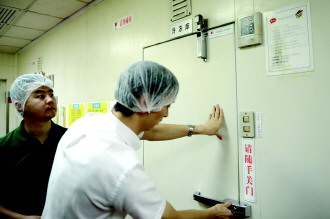 针对日前媒体曝光的上海福喜食品有限公司使用过期、变质等劣质原料加工食品的行为,上海、浙江、山东等地相关部门7月22日继续对使用上海福喜食品有限公司供货的麦当劳、肯德基和必胜客等快餐企业门店进行清查。  图为7月22日,在杭州市一家必胜客门店内,餐厅工作人员关闭封存有上海福喜食品有限公司生产的调味牛肉排的冷库。             新华社记者 鞠焕宗 摄