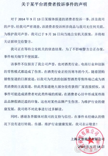 9月18日,1919酒类连锁子公司上海灵智商贸有限公司发表声明称:“对于2014年9月13日某媒体报道的消费者投诉一事,涉及我司的声誉,经我司严密调查,该消费者投诉所涉及商品与我司无任何关联。已于9月16日向公安机关报案,并将相关证据移交给警方。”