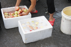 去年,记者也曾在红联新村亲眼目睹了小贩用洗衣粉水清洗桃子。除了桃子外,小贩们会对即将拿出来卖的苹果进行清洗,没有套袋的苹果覆着一些黑点和污垢,清洗后会比较好看。