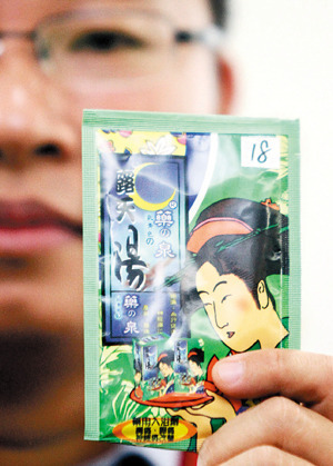 中新网12月17日电 据台湾《联合晚报》报道,民众喜欢冬天在家享受泡温泉乐趣,常会购买入浴剂(俗称温泉粉)。台湾“消费者保护处”调查市售44件温泉粉,发现有28件标示不合格,消保官点名“露天汤(青色の药泉)”宣称可治痔疮、湿疹等疗效,违反“药事法”,可开罚60万(新台币,下同)到2500万,其它标示不符如内容夸大、成分标示不全等产品,可依“化妆品管理条例”罚10万元以下。