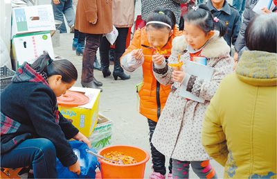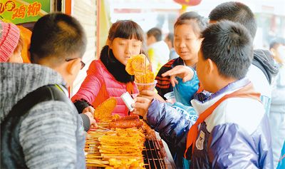 2月26日中午,兰州市兰铁二小门口,一些刚放学的小学生在流动摊点上购买小吃。