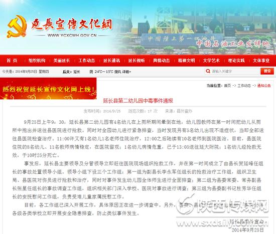 据延长宣传文化网于今天下午发布的公告显示:25日上午9点,延长县第二幼儿园有4名幼儿在上厕所期间晕倒在地,幼儿园教师在第一时间把幼儿从厕所中抱出并送往县医院进行抢救。同时对全园幼儿进行紧急排查,当时发现另有5名幼儿出现不适症状,当即全部送往县医院检查治疗。11:00许又有1名幼儿1名老师住院治疗,12:00之后陆续有10名老师到医院医治。目前,县医院住院的8名幼儿、11名教师病情稳定,在医院留观;1名幼儿病情危重,已于13:05送往延大附院;1名幼儿经抢救无效,于10时25分死亡。