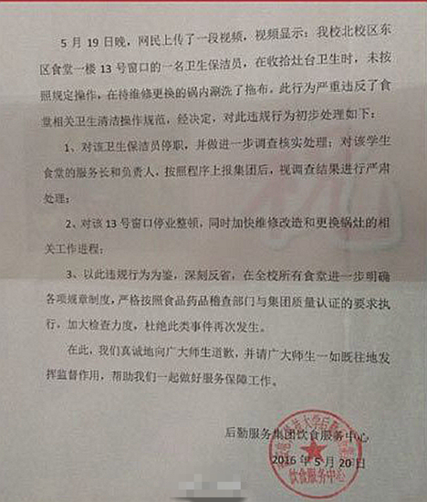网曝高校食堂工作人员在锅里洗拖把 已被停职