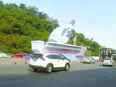 新浪微博:@-荡空山-:有人拍下来发微博么?大桥汉阳桥头咽喉要道路中心有人搞了个硕大的某品牌酒瓶模型广告,给大武汉添堵。