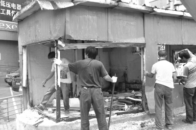 近日,海淀城管执法队联合相关部门,对苏州街一彩钢板结构早餐亭进行拆除。这家早餐亭位于苏州街一便道上,亭内没有水源,电从电线杆私接过来。经营者称,亭子是从别人手里转包的,主要卖煎饼、灌饼、烤肠、豆浆等。执法队员问及食品进货渠道等问题时,经营者支支吾吾说不清楚。  京华时报通讯员齐跃勤记者袁国礼摄影报道