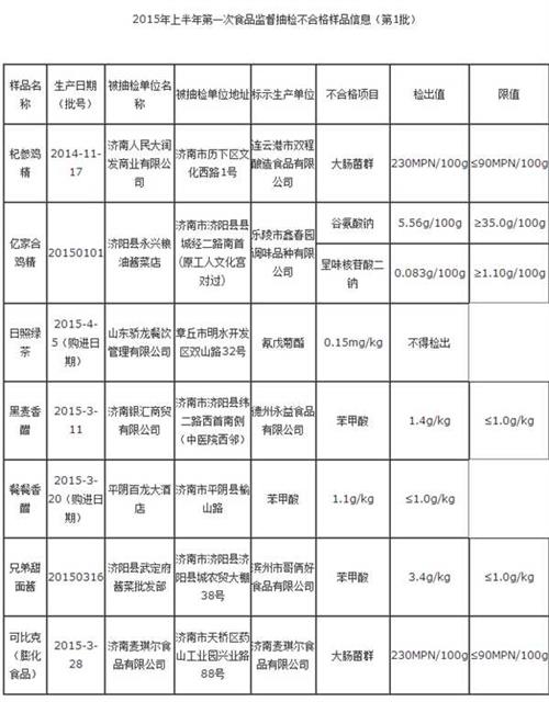 齐鲁网7月31日讯 记者从济南市食品药品监督管理局获悉,2015年第一季度,济南市药监局对15大类28个品种2000批次食品进行了抽样检验。第1批抽检样品包括:膨化食品、薯类食品、茶叶、酱油、食醋、酱类、鸡精、食用香料香精、淡水鱼、葡萄酒、液体乳、凉拌菜等12个品种578批次,检出不合格样品7批次,合格率98.79%。