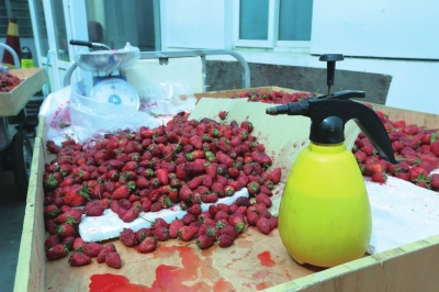 近日,东城城管直属一队的执法人员在南门仓胡同查获一名无照商贩。执法人员发现,该商贩持有一个喷壶,喷壶口的液体颜色发红且黏稠。城管队员用喷壶对商贩电动车上霉变的草莓喷液体,结果霉变草莓立刻显得“新鲜”。商贩自称,液体是糖浆之类的,是用来保鲜的,“无毒无害”。目前,执法人员对这名无照商贩售卖的草莓等进行暂扣,并将喷壶内的不明液体送检。  京华时报通讯员王超记者袁国礼摄影报道